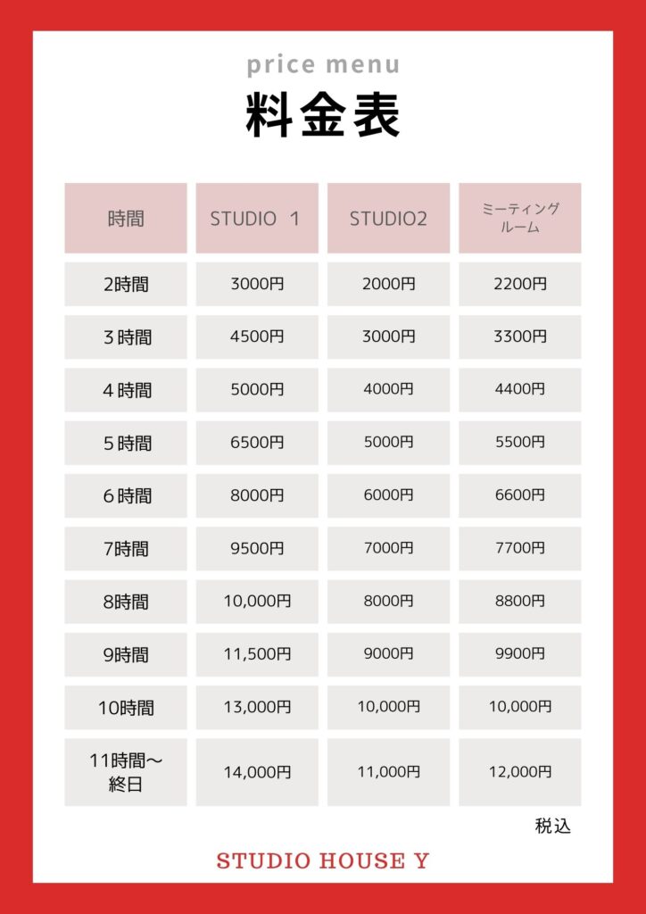 STUDIO HOUSE Y ご利用料金表 STUDIO HOUSE Y X Facebook LINE 2026.01.19 予約サイトの都合上、STUDIO1のご予約時の金額と実際の金額が違う場合があります実際のご利用金額はこの表のとおりです 当日の予約票にはこの金額が記載されます